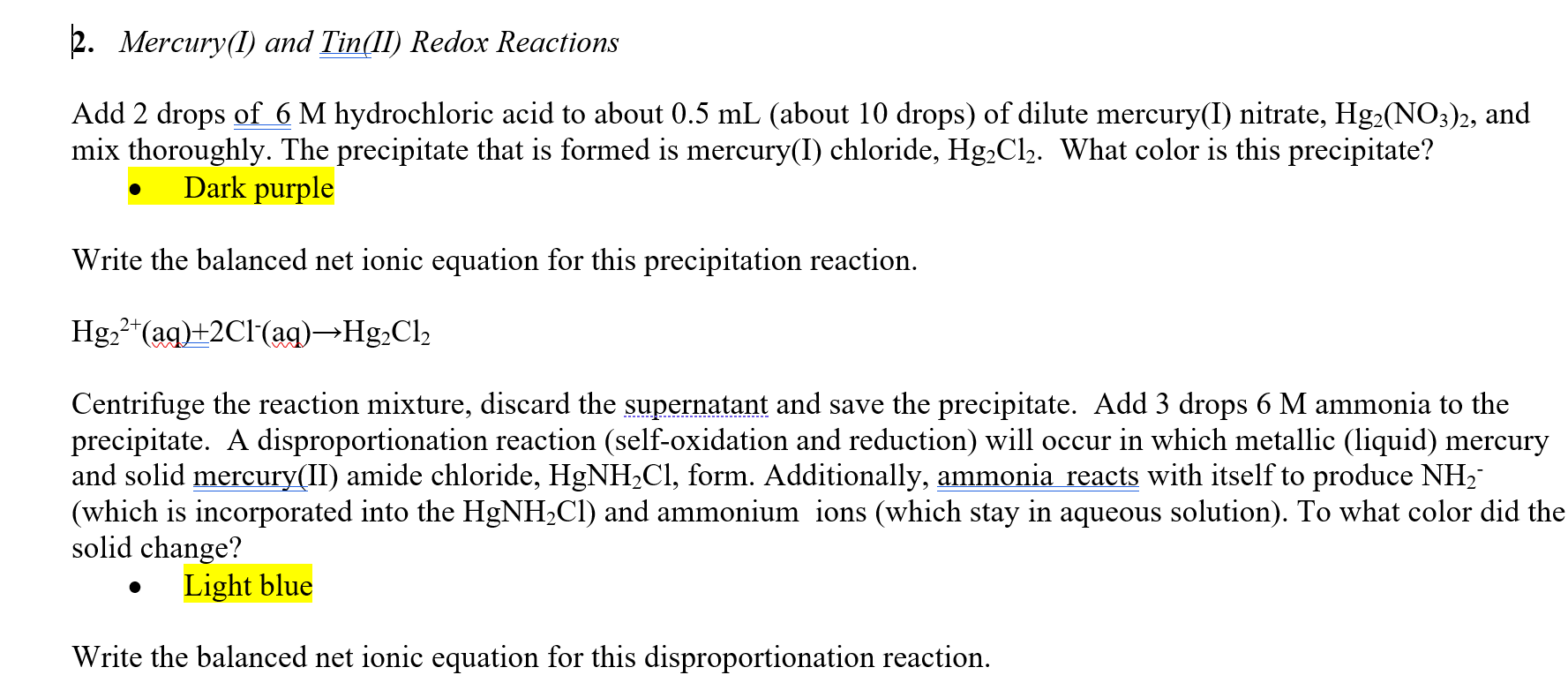Solved K Mercury I And Tin Ii Redox Reactions Add 2 Drops Chegg Com